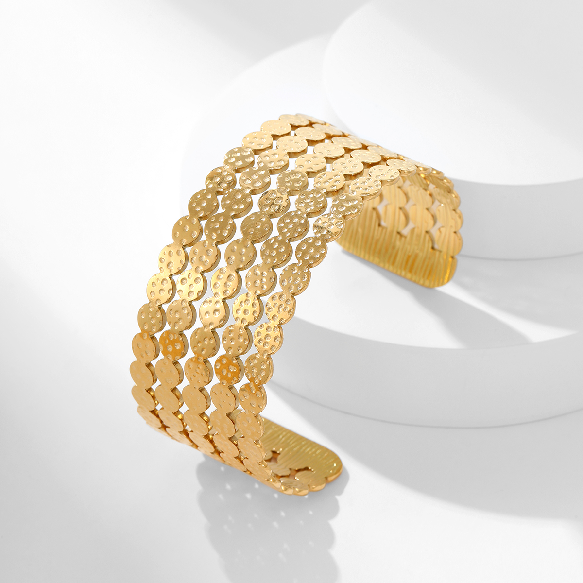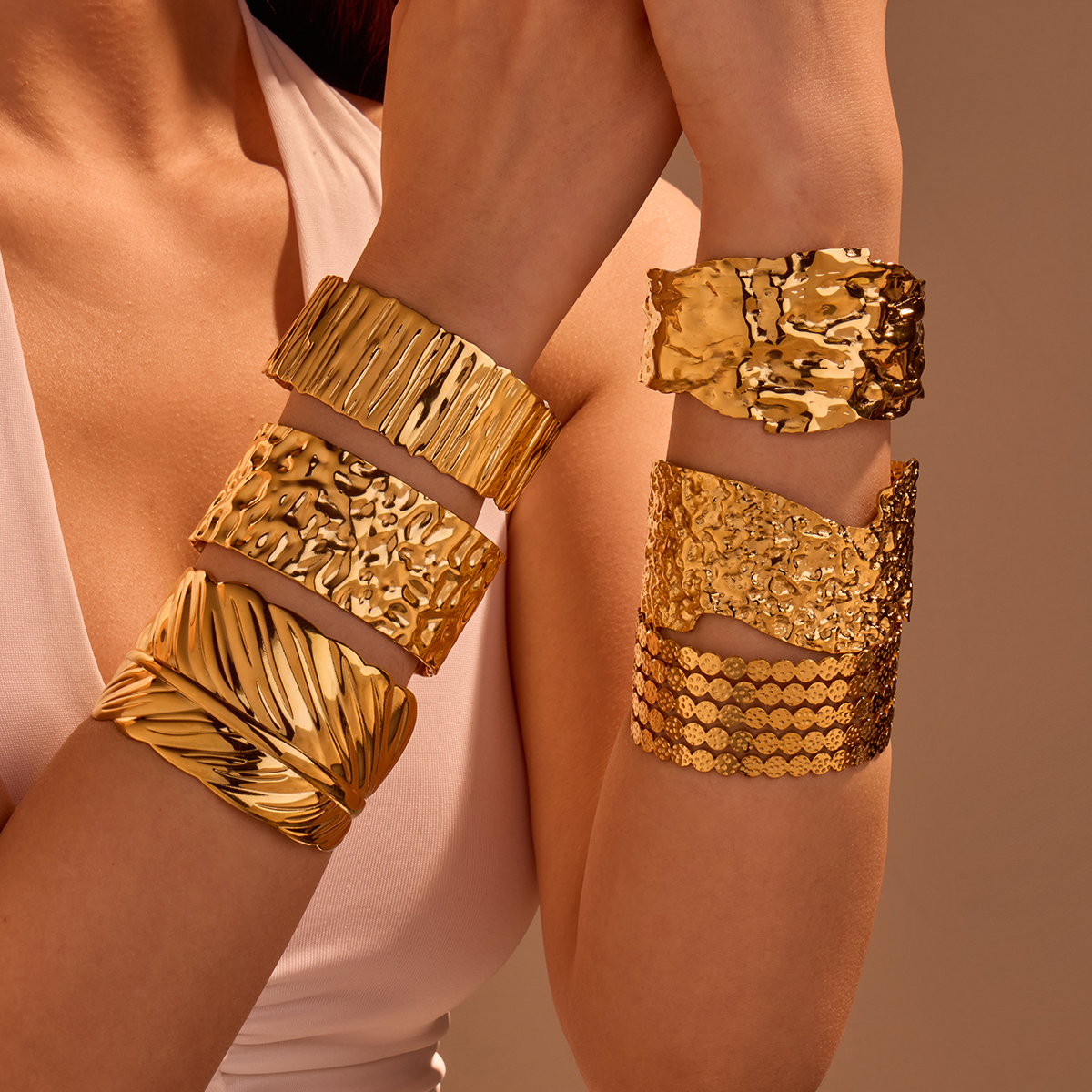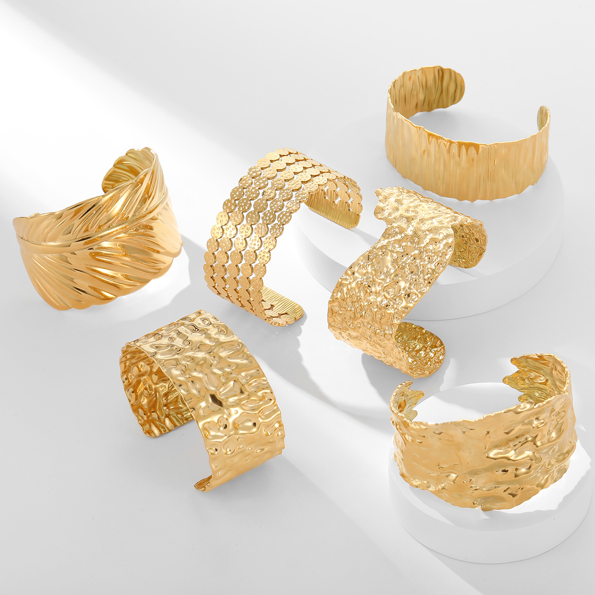 经典18K镀金不规则纹理宽开口朋克风手镯