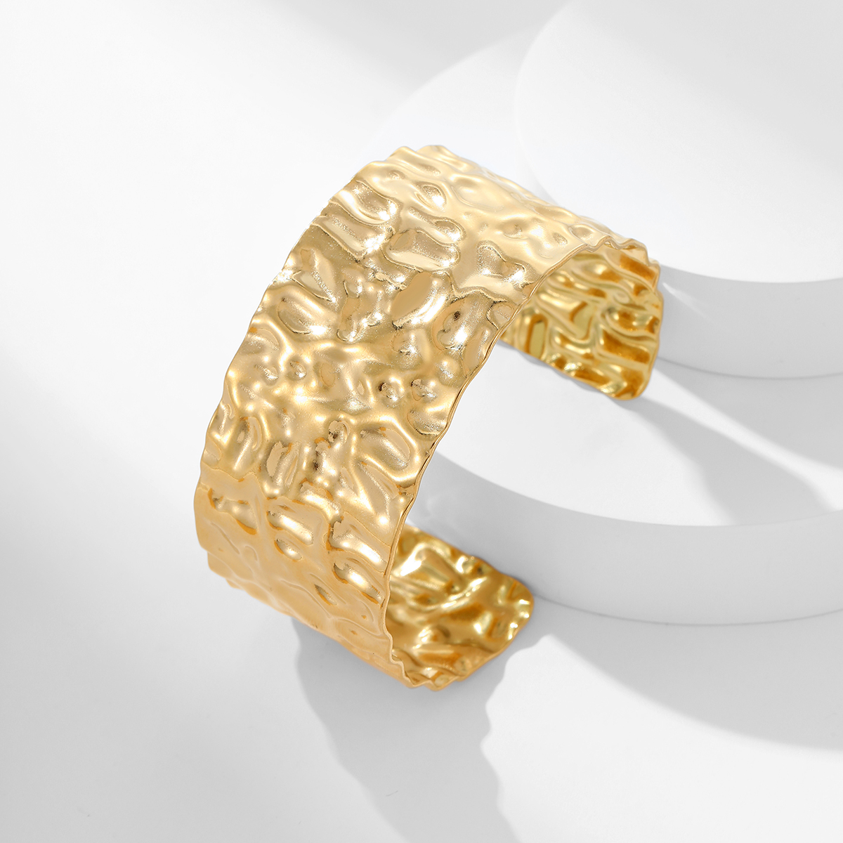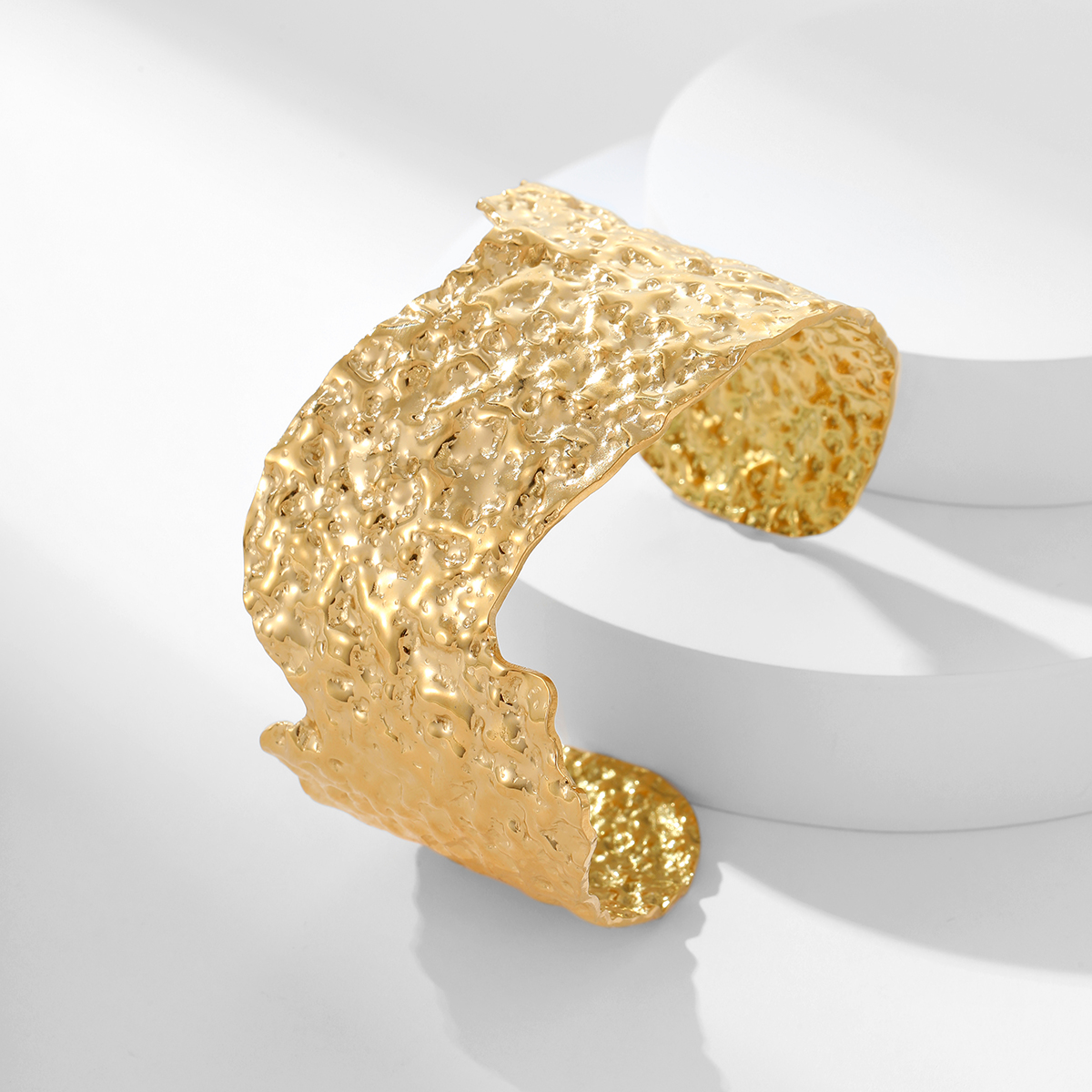"经典18K镀金不规则纹理宽开口朋克风手镯"
